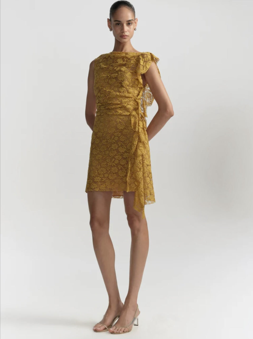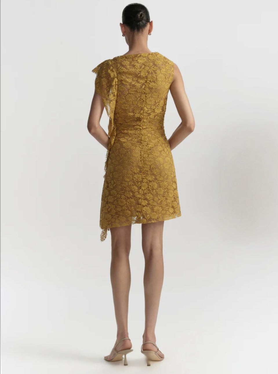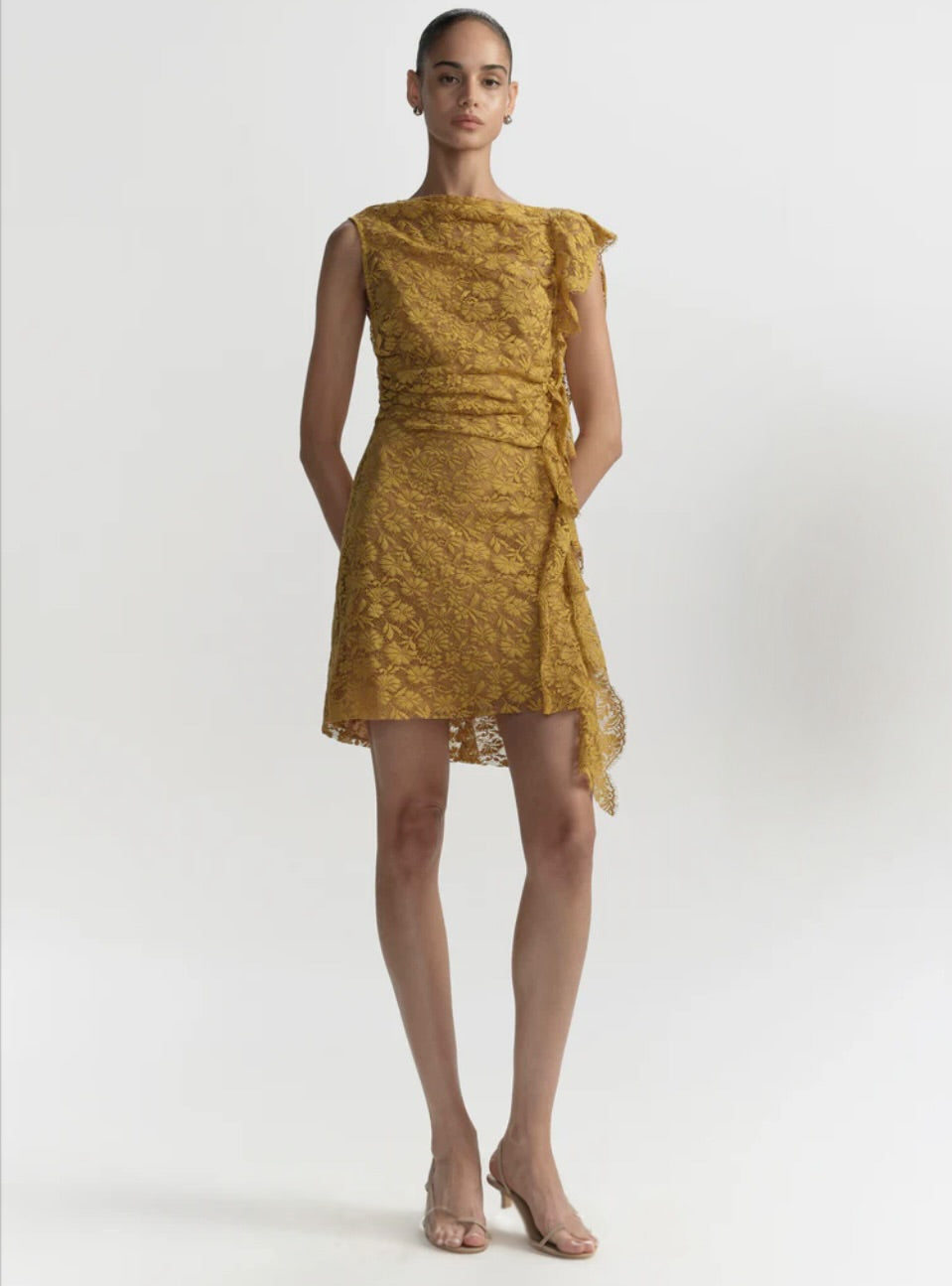 The Astra Dress is crafted from French botanical lace in an antique gold hue. This one-shoulder mini features asymmetric gathering and ruffled edges.
