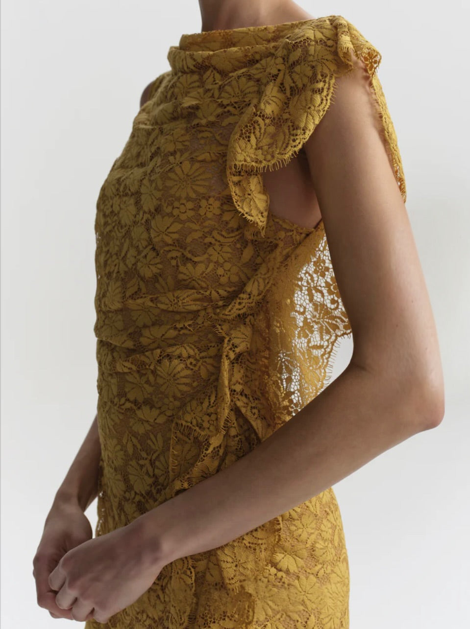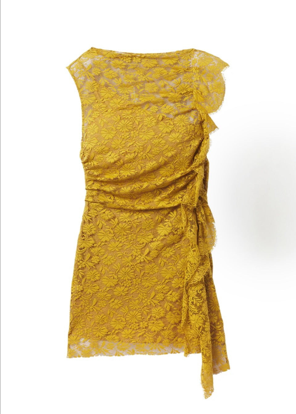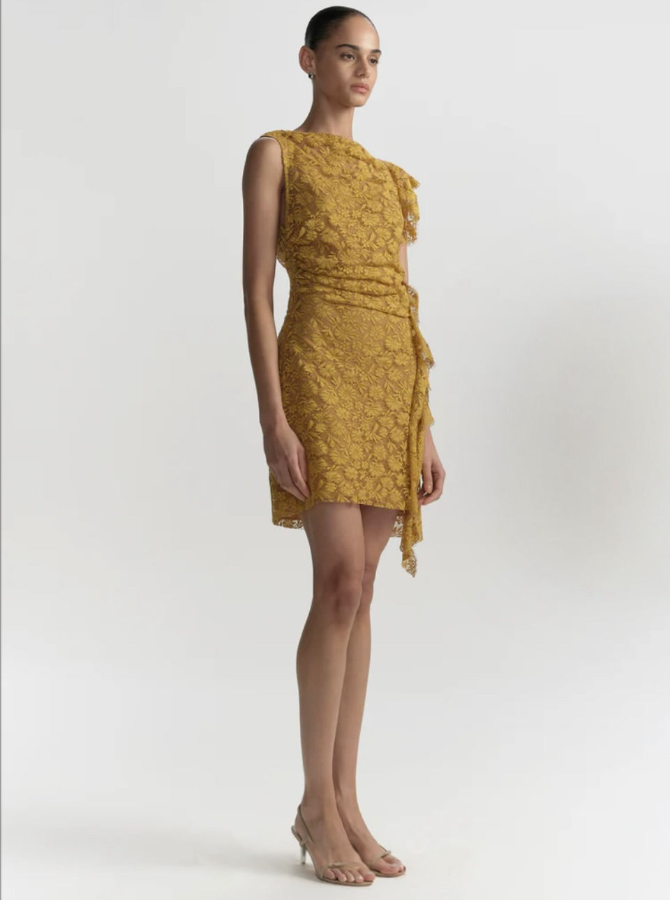The Astra Dress is crafted from French botanical lace in an antique gold hue. This one-shoulder mini features asymmetric gathering and ruffled edges.