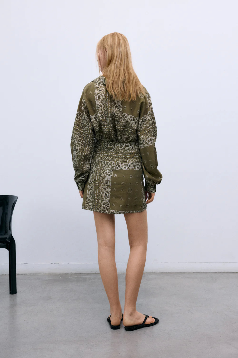 Wrap style skirt in soft, fluid tencel with a front overlap and hidden button closure for a clean finish. Features a beautiful bandana print that adds character, making it an easy and versatile piece to pair with the matching shirt.