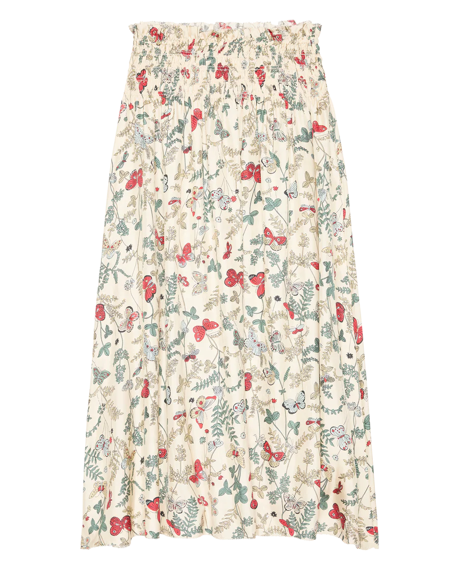 waistband with rows of channeled elastic and is finished with a delicate picot-edge ruffle. Intended to hit above the ankle, it is crafted from our silk twill and is perfectly versatile in Spring's Floating Butterfly Print.