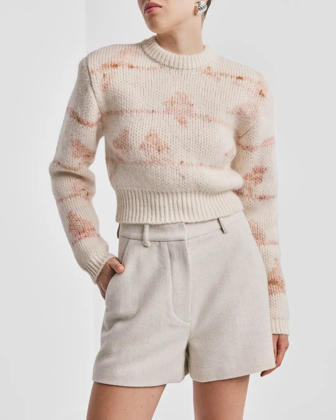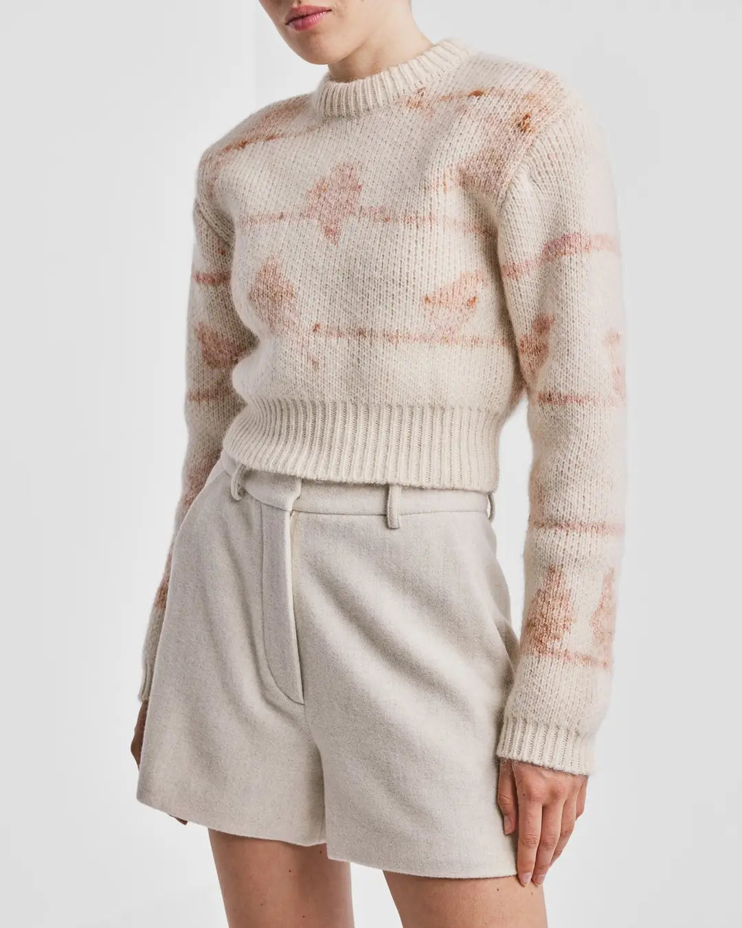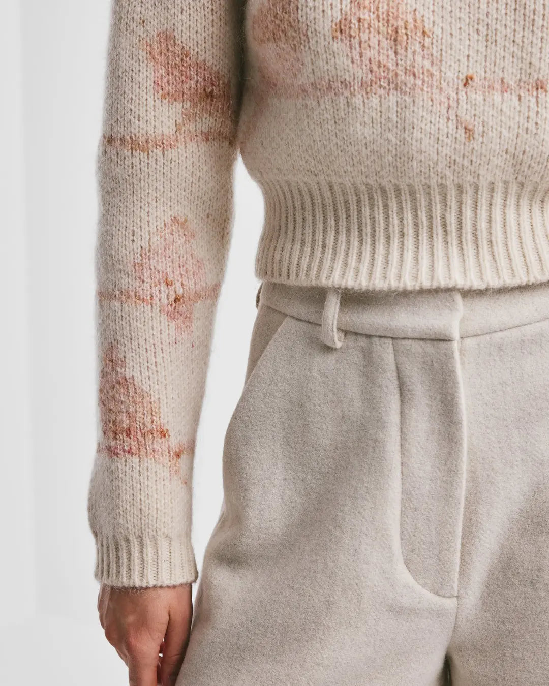 The Jacquard Knit Sweater is cut in RWS and RMS certified wool qualities. The sweater has a loose fit with a cropped, fitted hemline, long sleeves, and a rounded crew neckline.