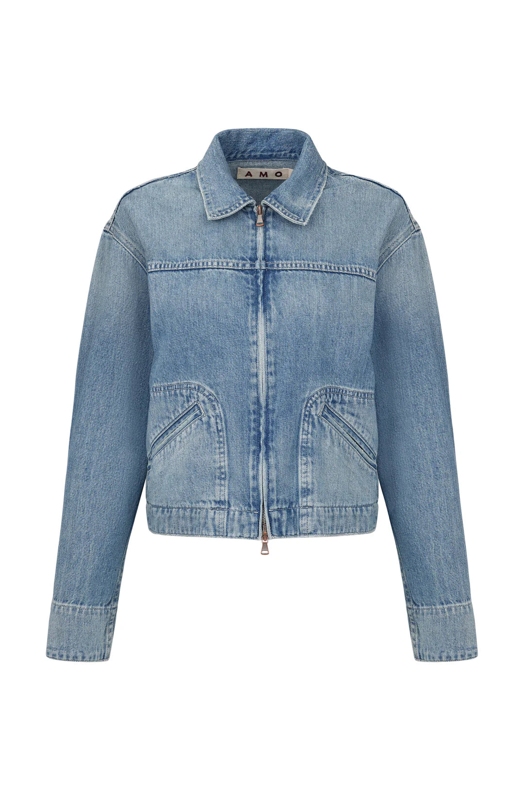 A slim-fit denim moto jacket featuring a zip front and streamlined zipped pockets.