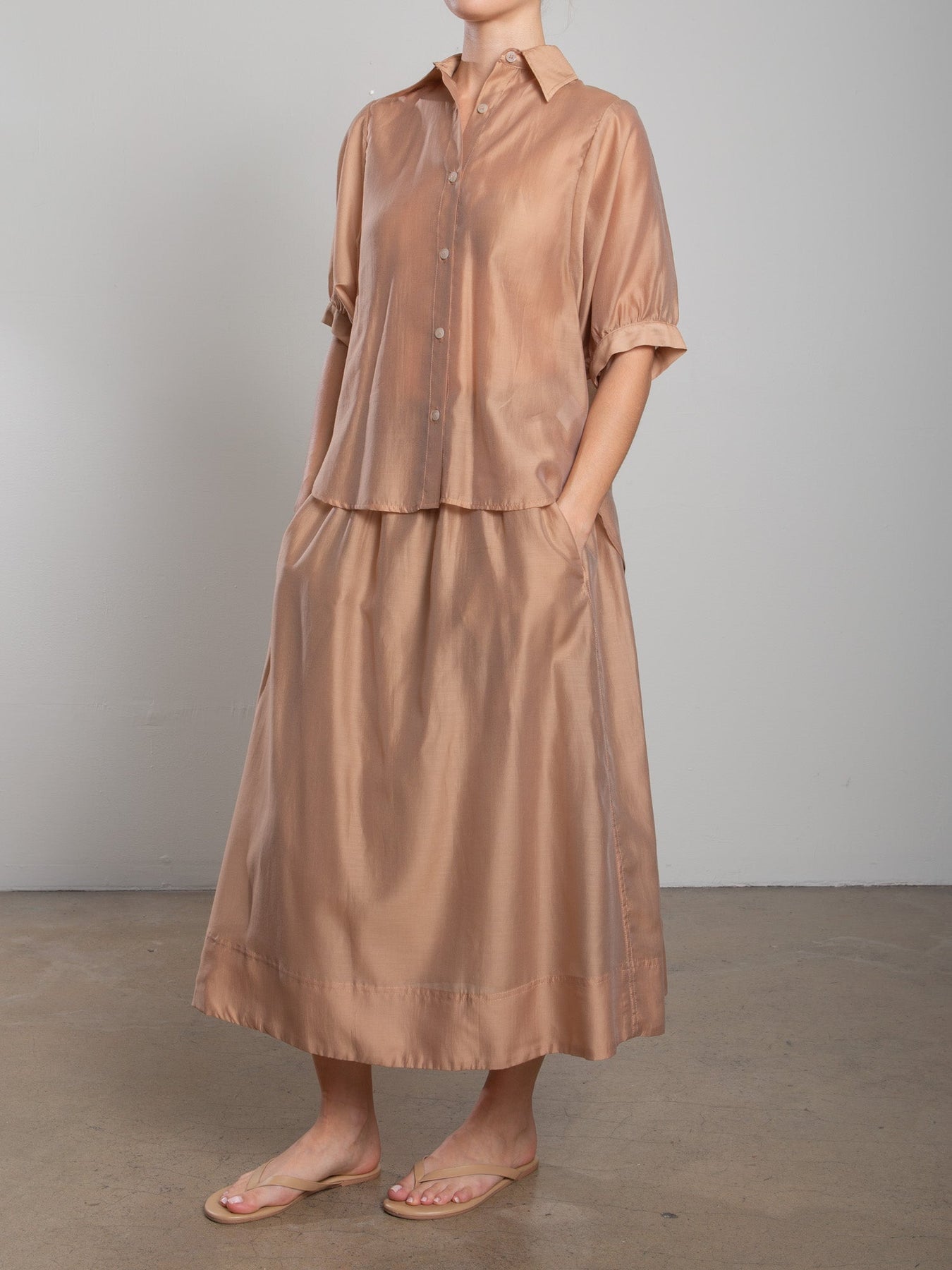 Full midi skirt with side panel detailing and elastic waist.