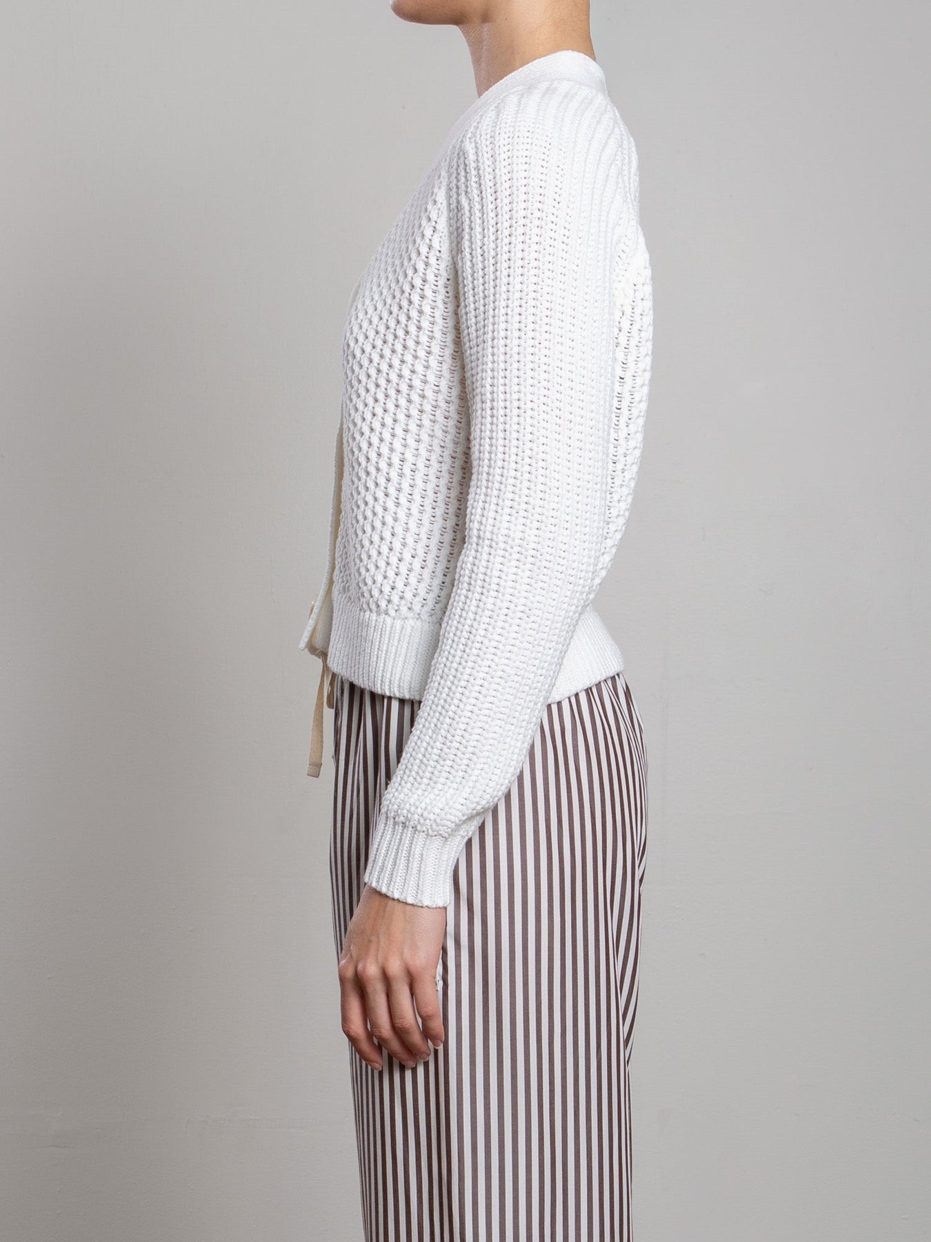 V-neck cardigan with novelty honeycomb stitch in the body and ribbed accents.