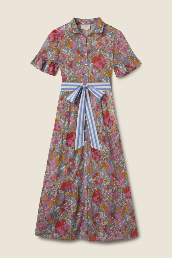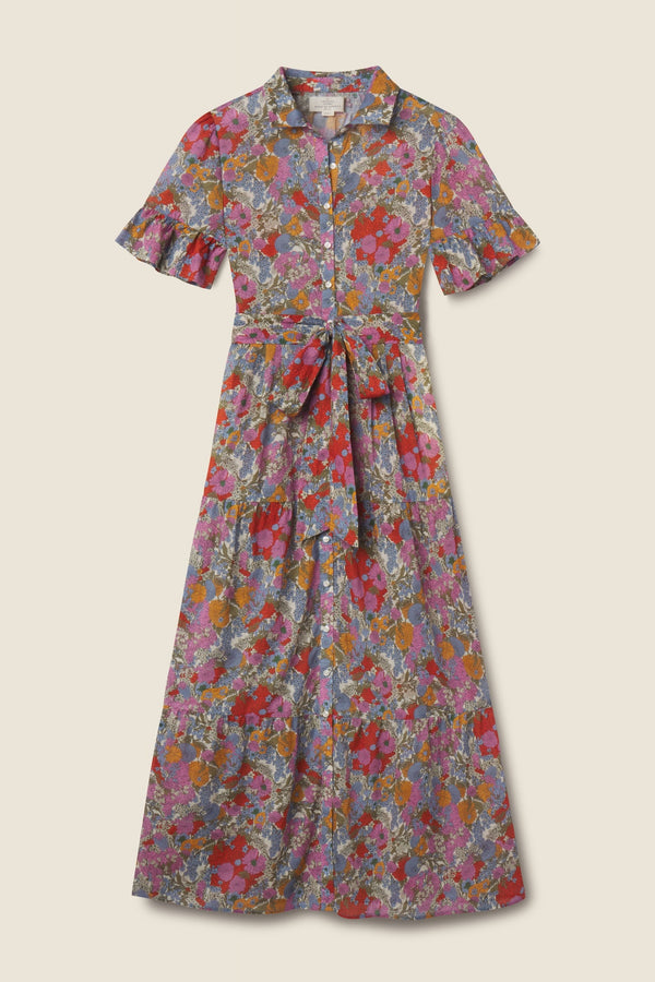 The Martine dress is long and flowing, reaching the ground. Long pleats from the waist give extra movement to the tiered skirt. Completed with antique white buttons and matching self-fabric sash. Shown here in Delicate Tilia and made from cotton voile.
