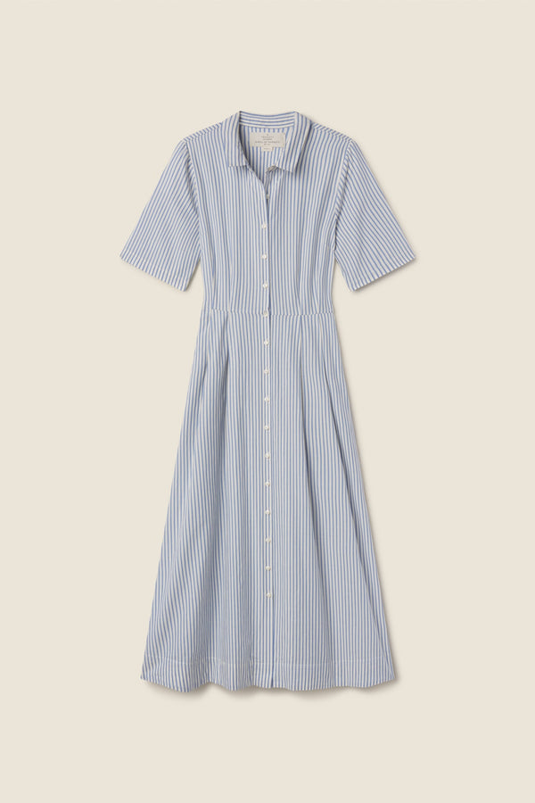 The Aster Dress is a vintage-inspired shirt dress with a cinched pleated waist, full-button front and elongating midi hemline. Featuring signature hip pockets and cuffable short sleeves. Made from coastal cotton twill and shown here in Seaside Stripe.