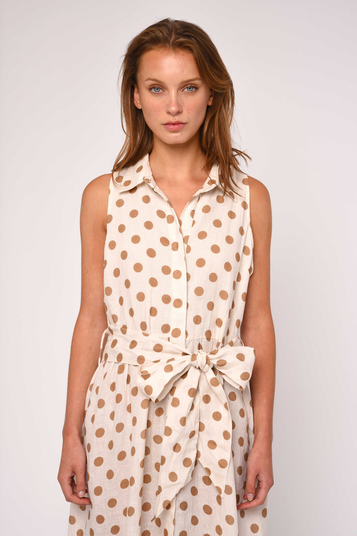 Meet your new favorite sleeveless shirt dress.The Arlene Dress in Jane Polka Dot. Crafted from soft, lightweight fabric, it features a functional center front placket with shell buttons.