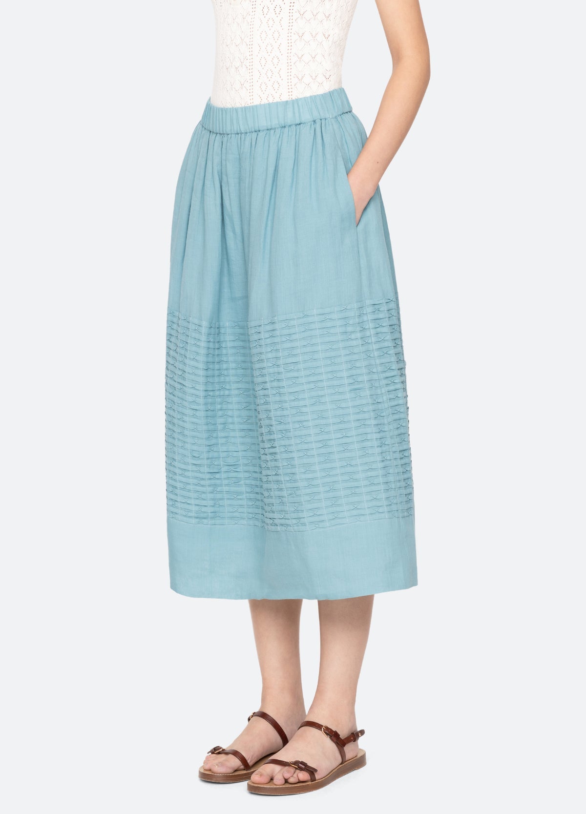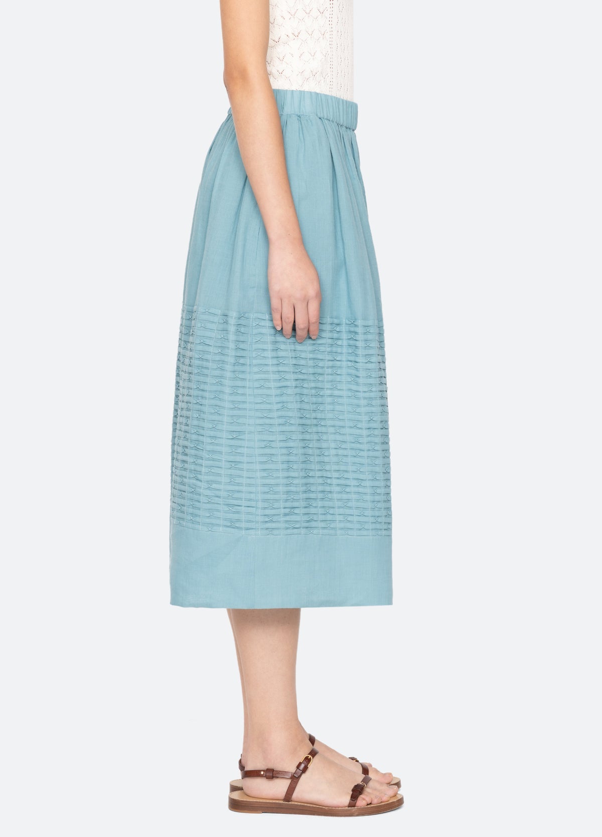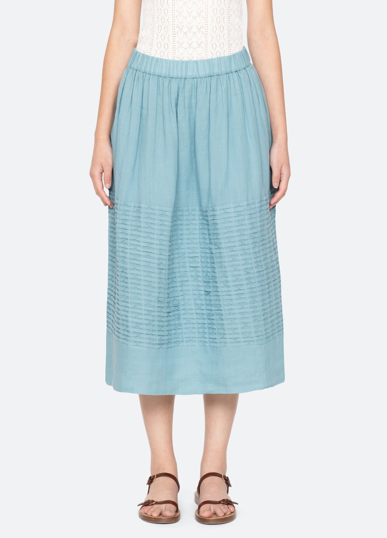 The Violet skirt features pintuck detailing, an elasticized waistband, and a breezy midi silhouette. Paired with the Violet tank, it creates a fresh, effortless spring outfit.