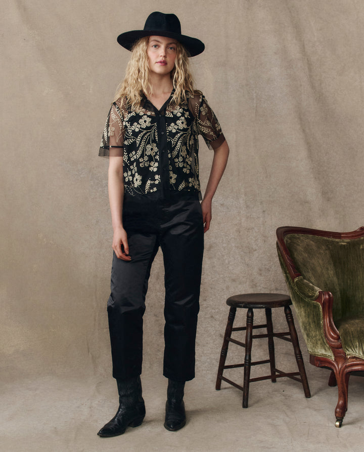 shirt is crafted from a delicate printed mesh that looks just like the texture of vintage fabric. It features a boxy fit, straight-cut sleeves, and a crisp collar with a raw-edge hem that adds subtle charm. Lightweight and sheer, it’s a statement of contrast—structured and soft all at once.