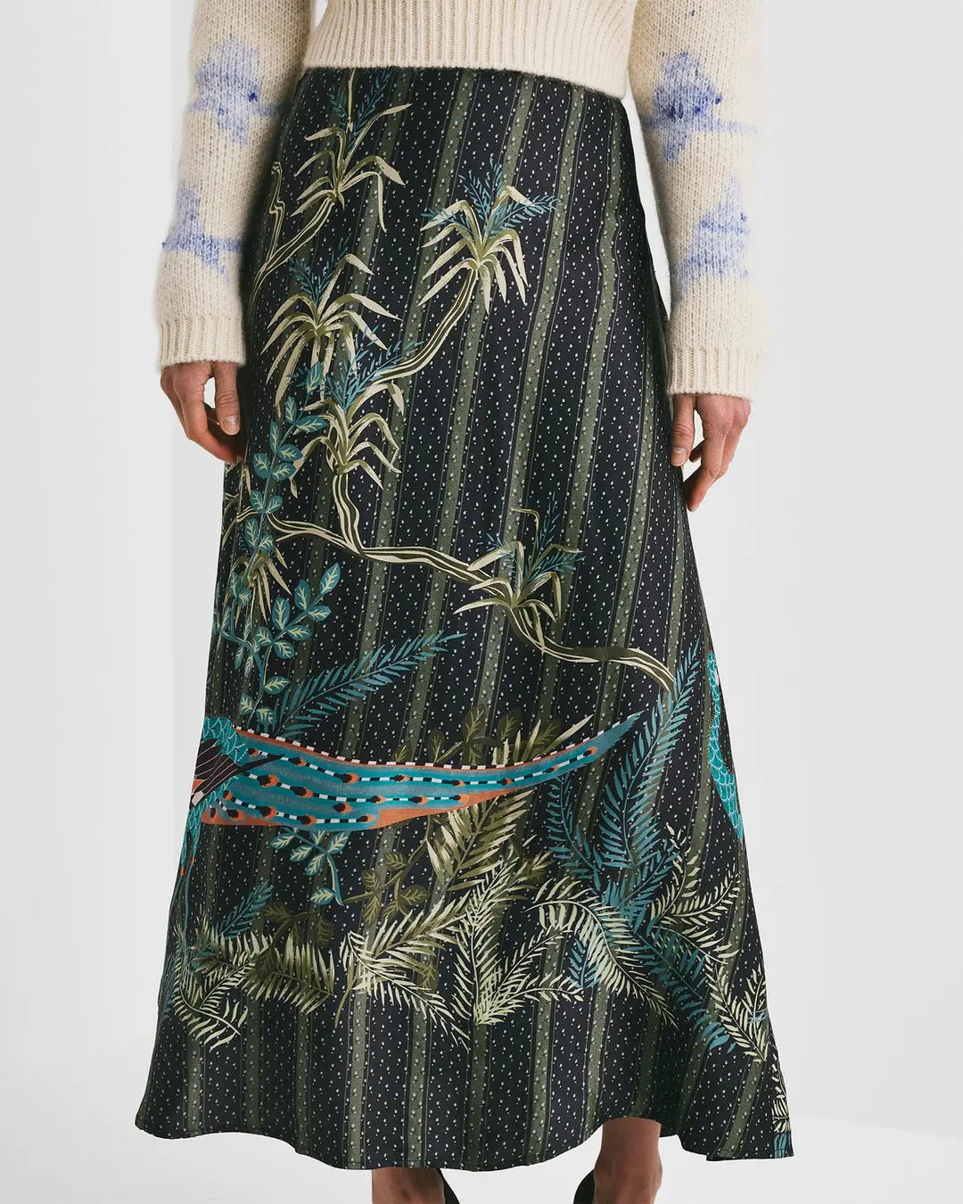 The Satin Skirt is cut in our shiny and elegant FSC certified viscose quality. The skirt has a midi length and an A-line silhouette. It features a side zip closure.