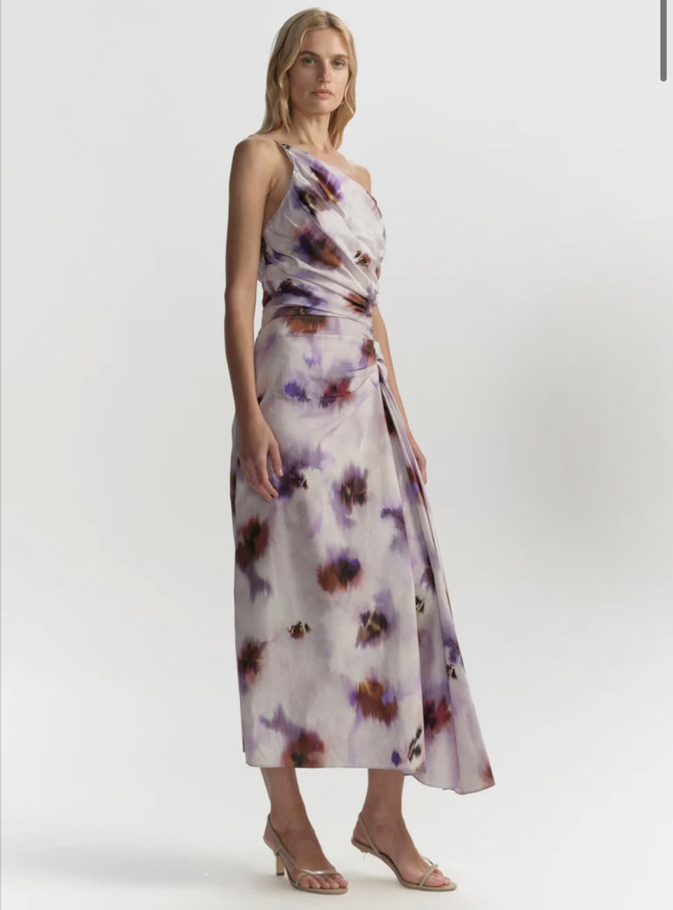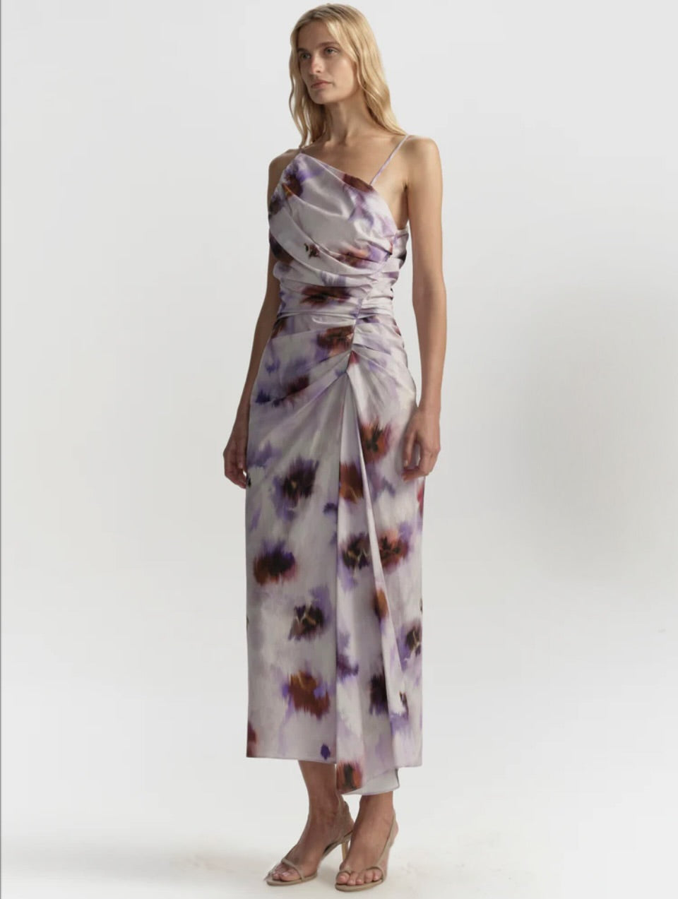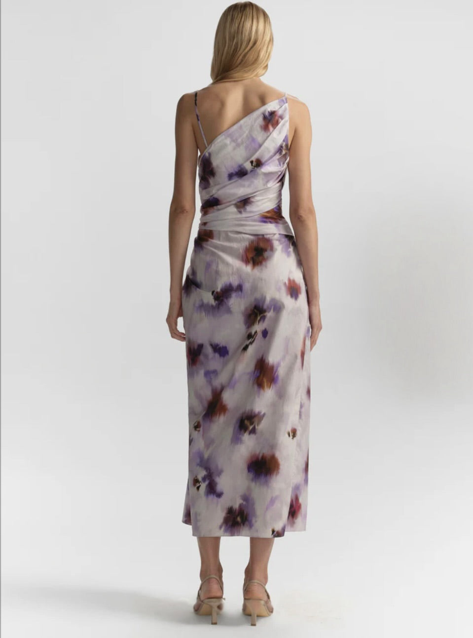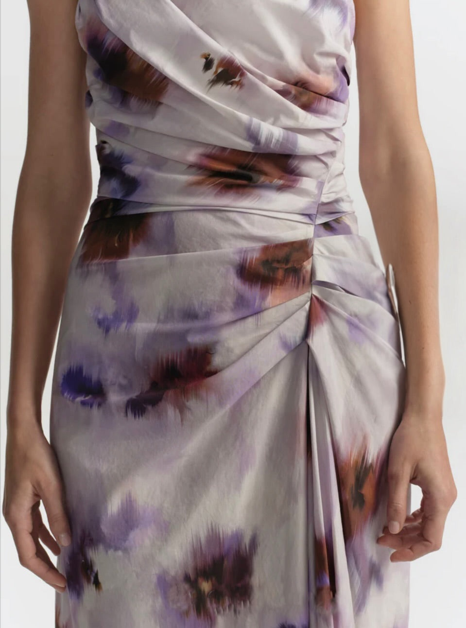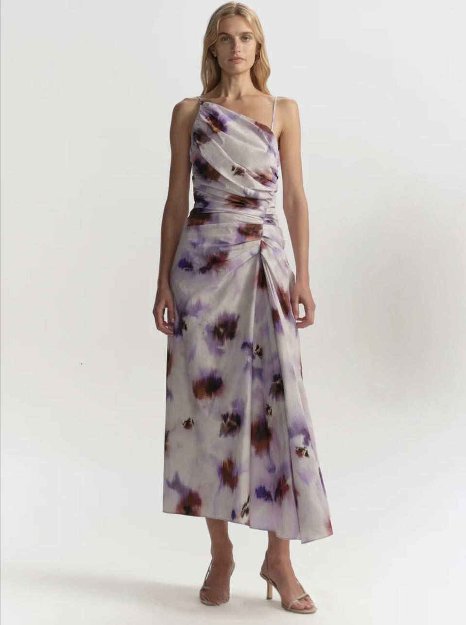 The Juno Dress is crafted from cotton poplin featuring a bold, hand-painted abstract print. This sleeveless midi silhouette features an asymmetrical neckline, delicate strap detail, soft ruching through the bodice, and a fluid draped skirt. This dress is made from non-stretch fabric, if in between sizes, we advise sizing up.