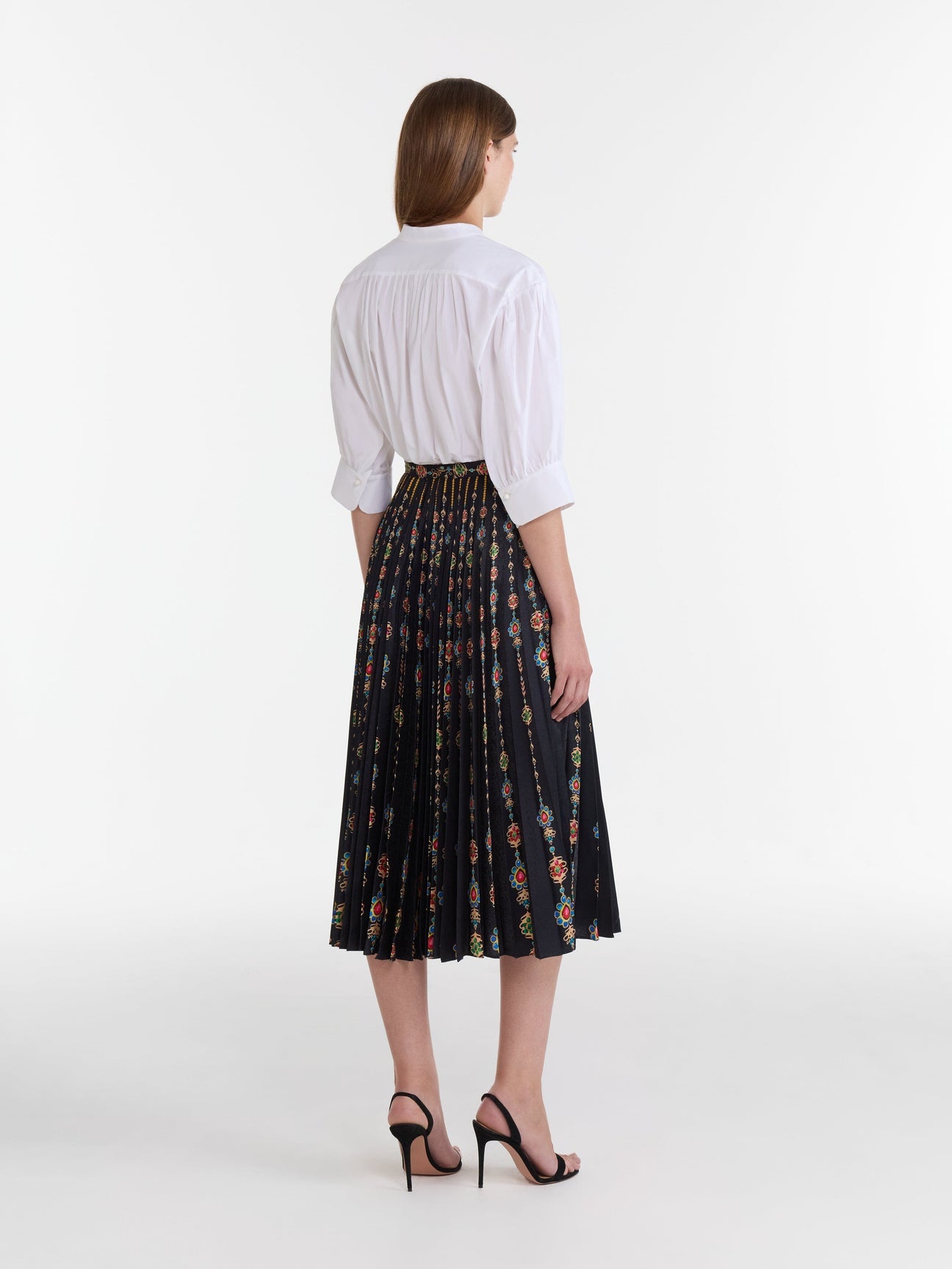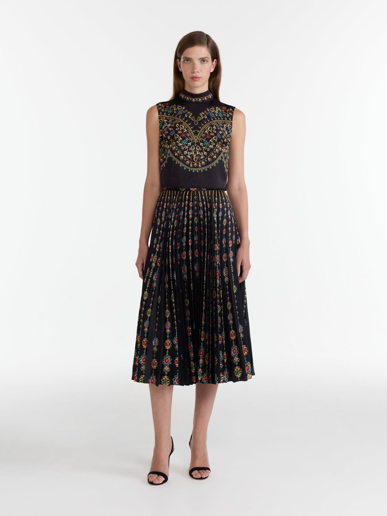 The Kim Skirt in Pendant Stripe playfully reimagines our signature sunray pleated silhouette by adding glittering embellishments. Striking, pendant-like gemstones glimmer within ornate, golden stripes, set against a deep, noir ground, creating a sense of richness and depth. Crafted with a flattering fitted waistband, this elegant midi-length skirt flows effortlessly, catching the light with every movement. Perfect for day-to-evening versatility, it can be paired with the matching Ren Top for a coordinated look that embodies SALONI’s effortless sophistication.
