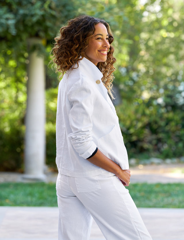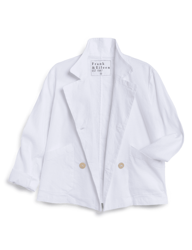 Prepare to be obsessed with this lightweight Frank & Eileen jacket. Italian Performance Linen gives a more structured, beautifully tailored look and feel to everyone’s favorite cropped peacoat, perfect for warmer days.