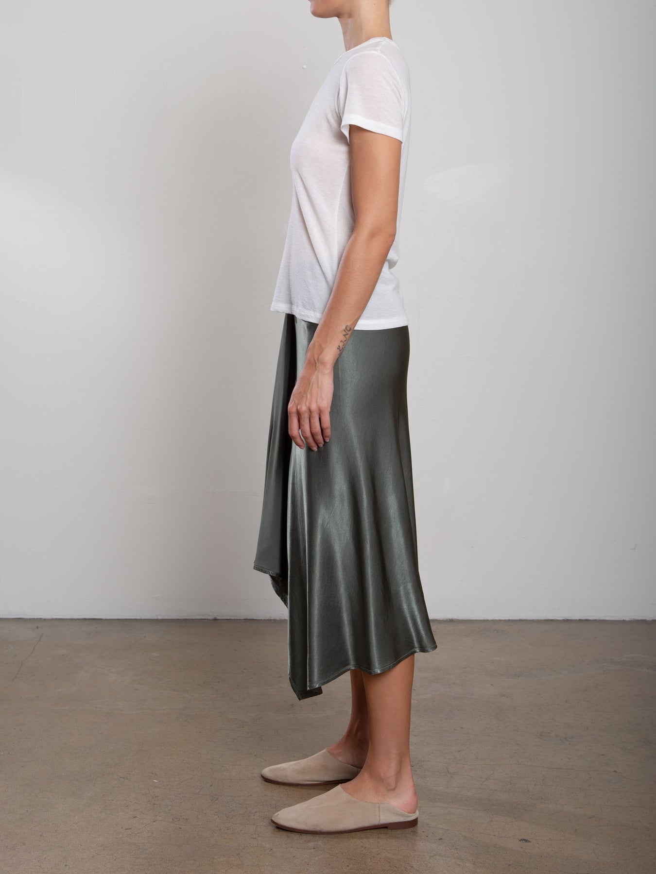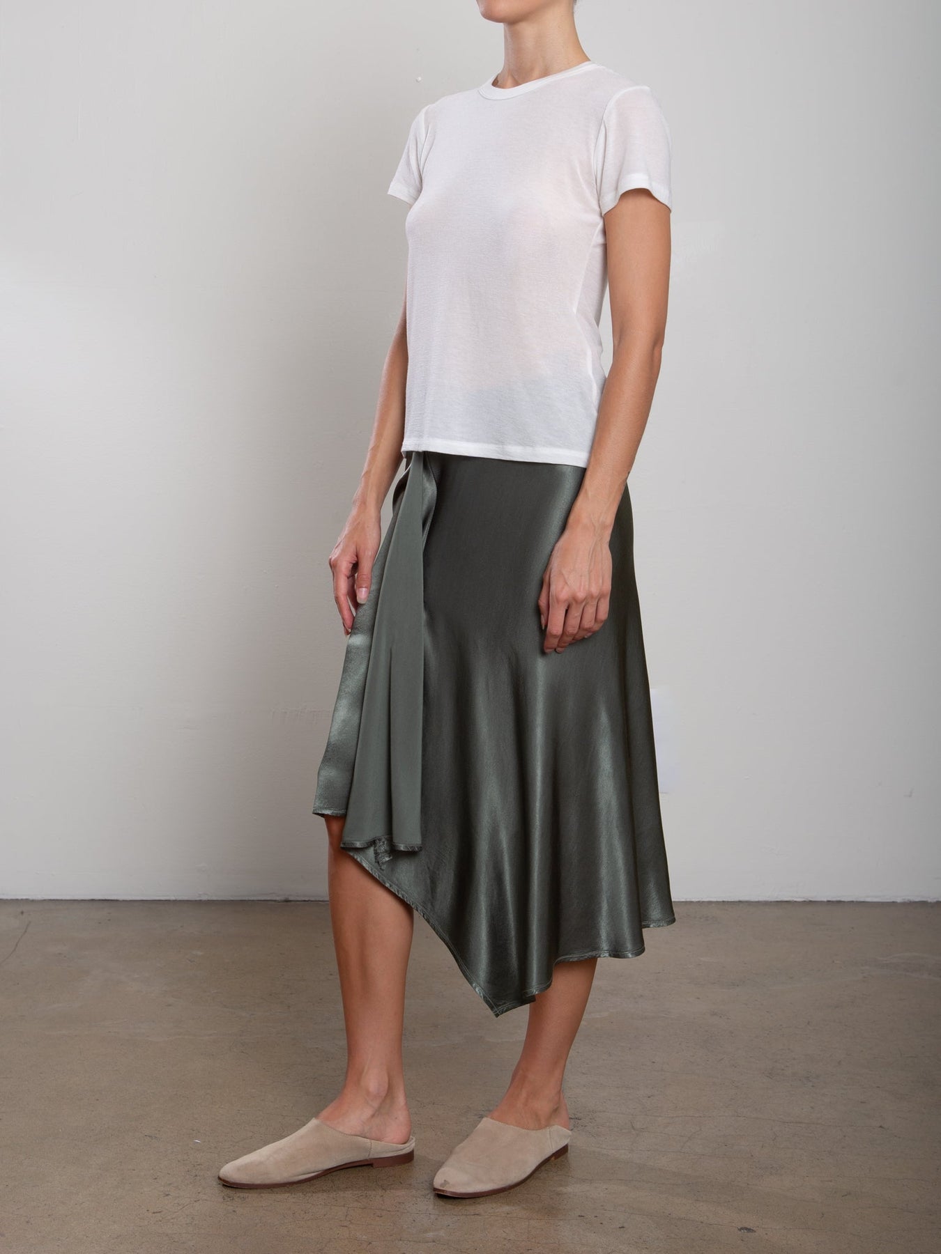 The Samara Skirt is cut with a fluid, asymmetric drape in our signature Vintage Satin. It features an elasticized waist and invisible front zip for easy wear. Finished with raw-edge fringe at the front. Lined for extra coverage.