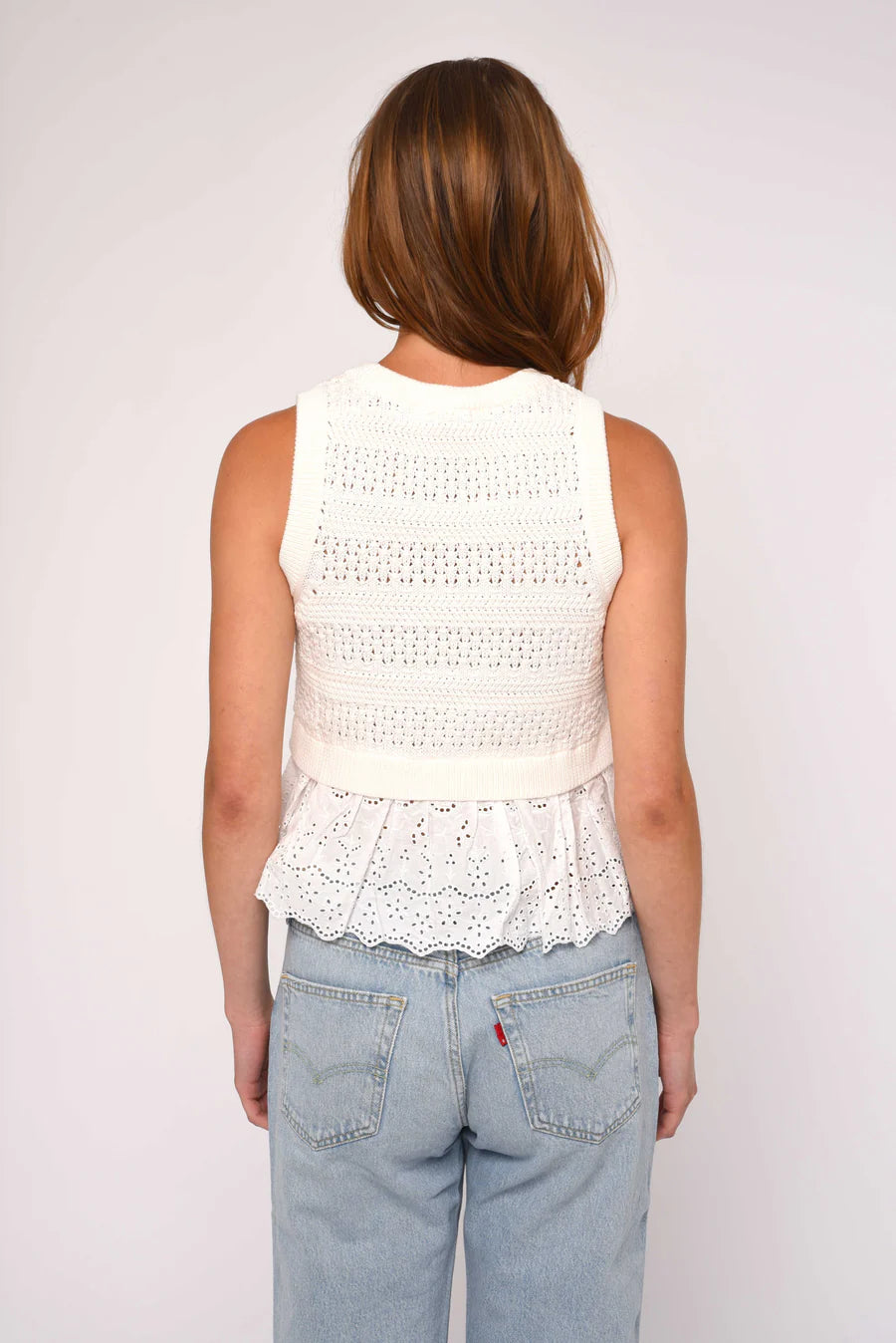 Meet the Ebba Sweater, a modern take on the classic sweater vest. It features intricate knit detailing throughout, with a cotton poplin peplum ruffle peeking out from underneath, all in a timeless ivory shade.