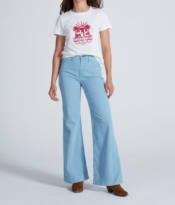 Featuring a flattering slim fit through the hips and thighs, these trousers create a wide-leg silhouette starting just above the knee. Made in Los Angeles from 98% cotton and 2% polyurethane 9 oz stretch twill, these trousers deliver a leg-lengthening look while offering flexibility for all-day wear. Closure: Button closure. Care: Machine wash cold separately, do not tumble dry. Model is 5'9" and is wearing a size 25, with measurements: Rise 12", Inseam 33", Leg Opening 24".