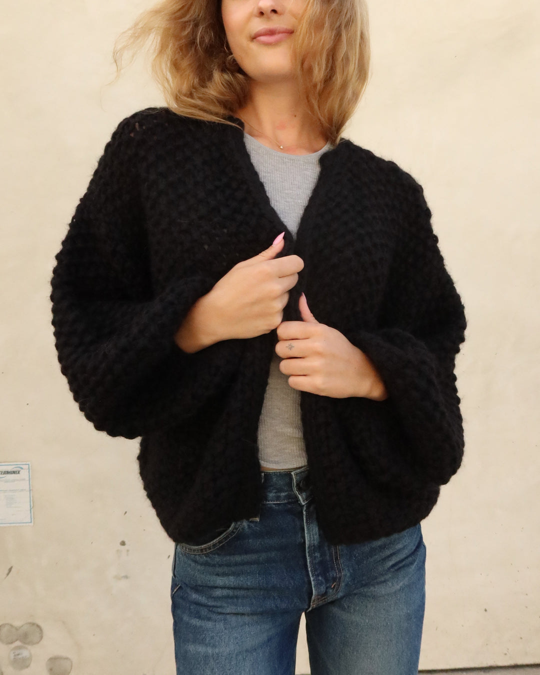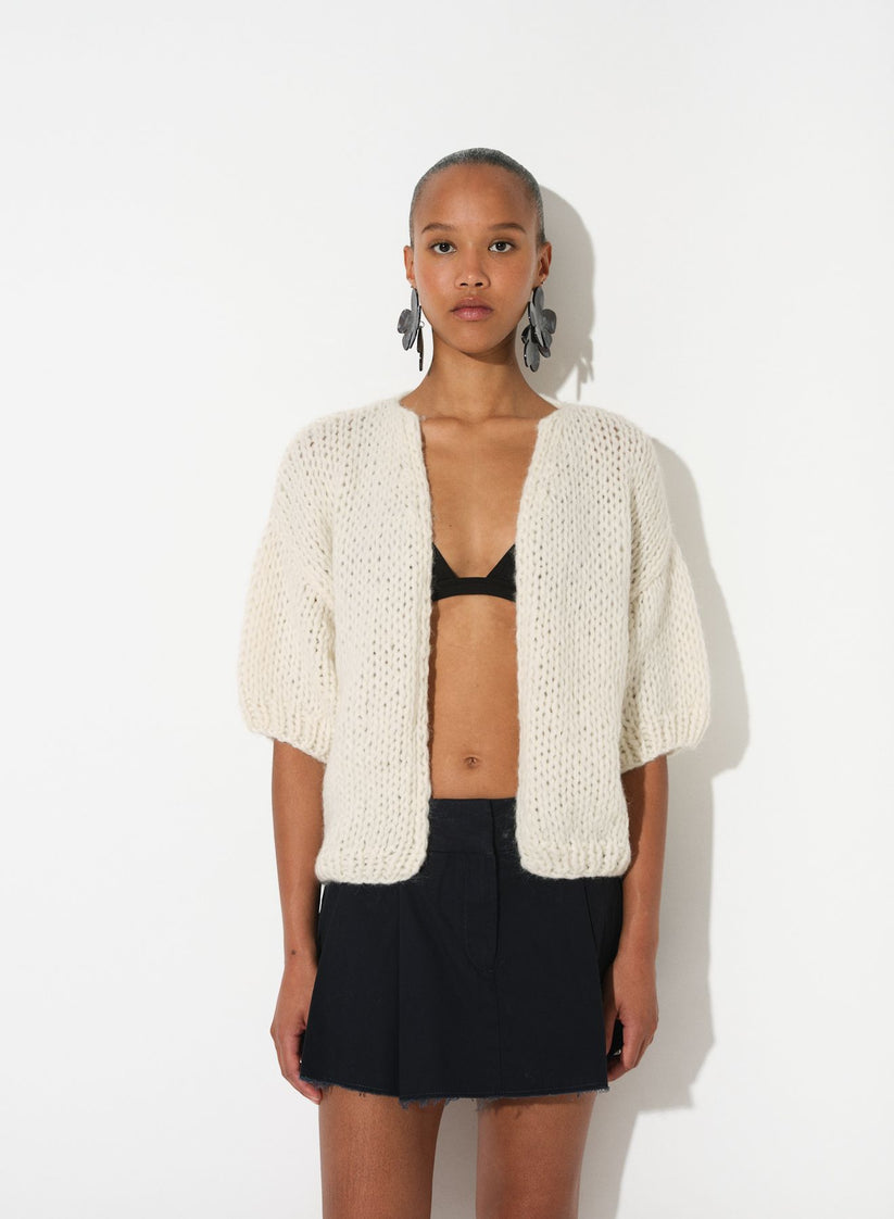 This piece is made of 70% Baby Alpaca, 23% Polyamide, 7% Merino Wool. Care: airing is best, if necessary dry cleaning only
