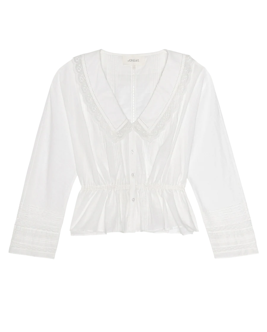 years, The Harper Top. captures the romance of the era with delicate lace and pintuck detailing set against a floaty cotton fabric. A 1940s-inspired collar with an open V-shape adds subtle structure, while dolman sleeves taper gently to the wrist for a soft finish. The fit is loose and easy through the body, complete with an interior waist channel and delicate cotton tie that allows you