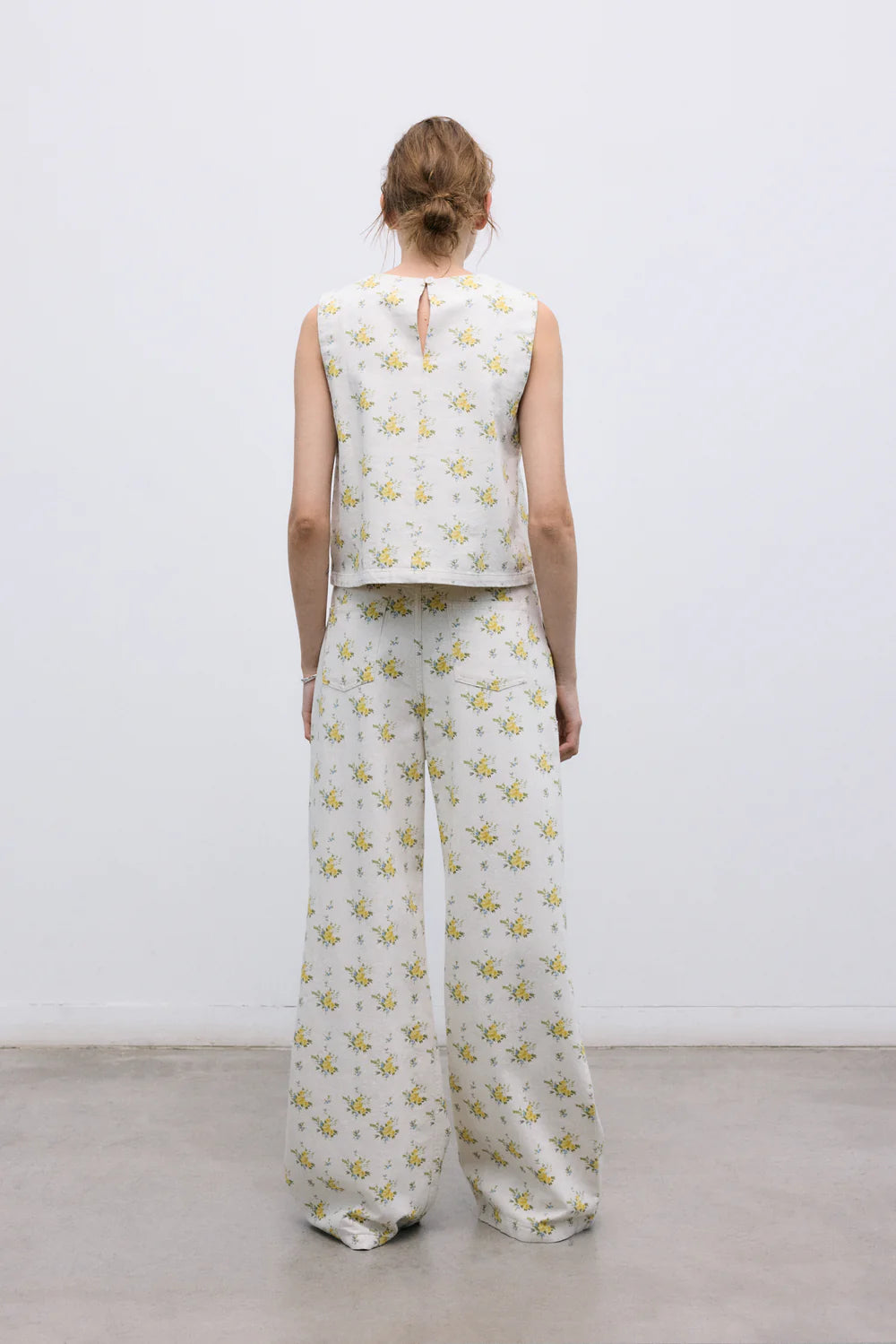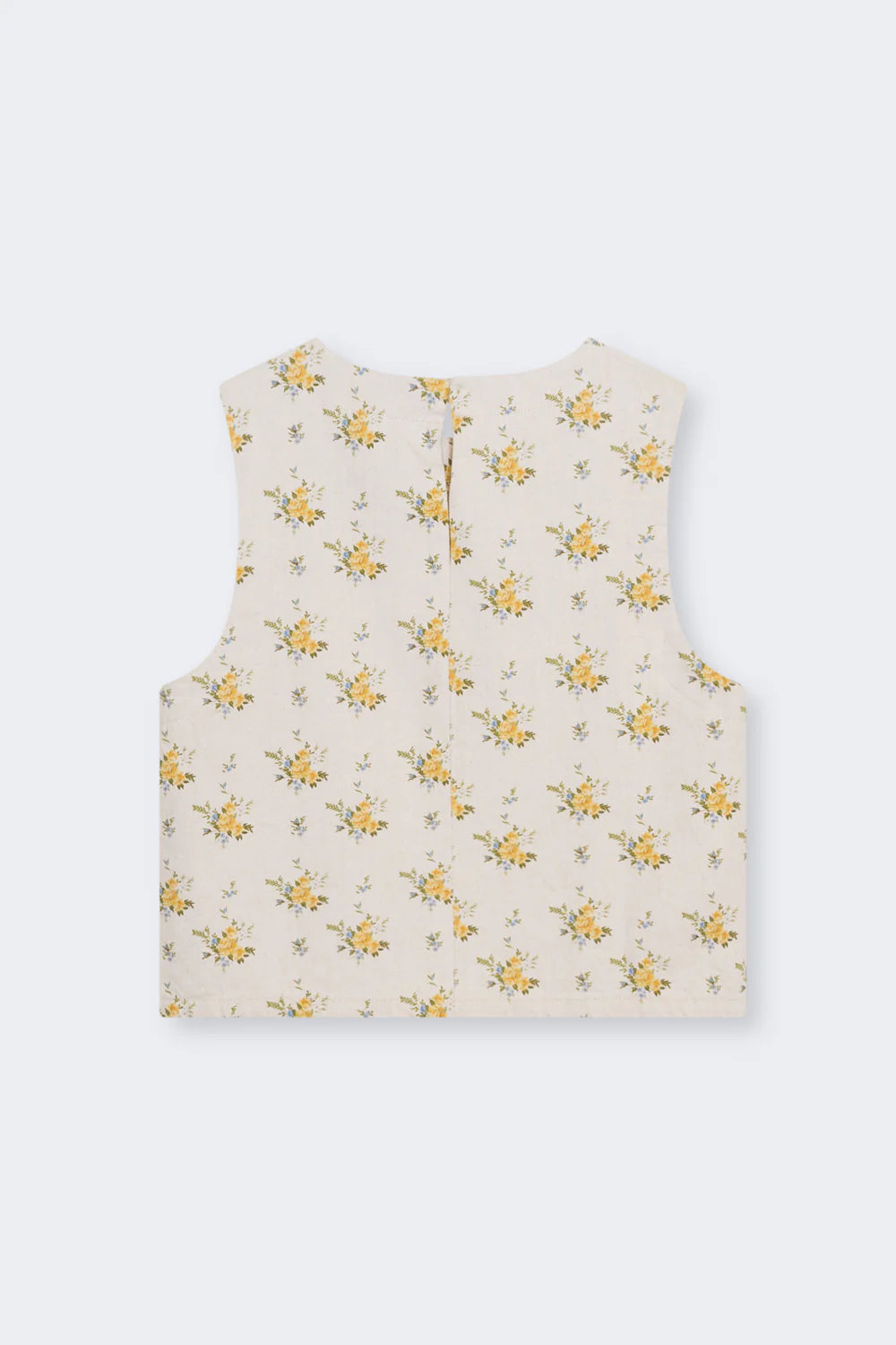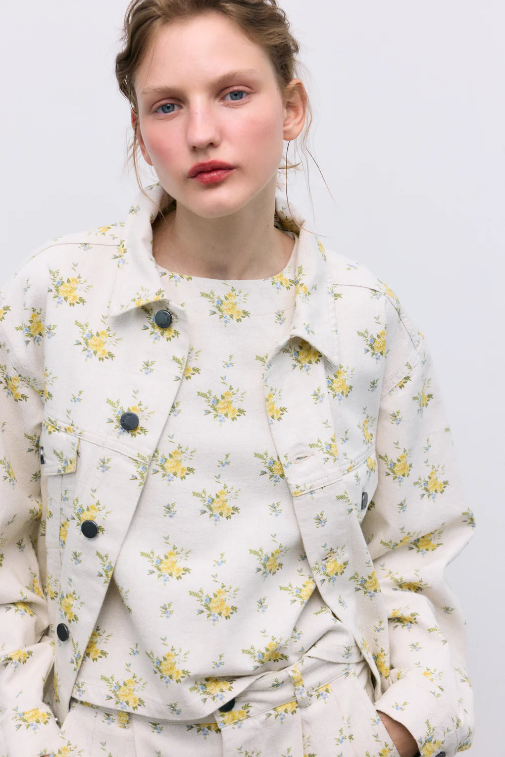 Crafted from organic cotton denim, this top features a beautiful floral print and a delicate back opening with a keyhole and button closure. A versatile piece designed to pair perfectly with the matching pants and jacket for a complete look.