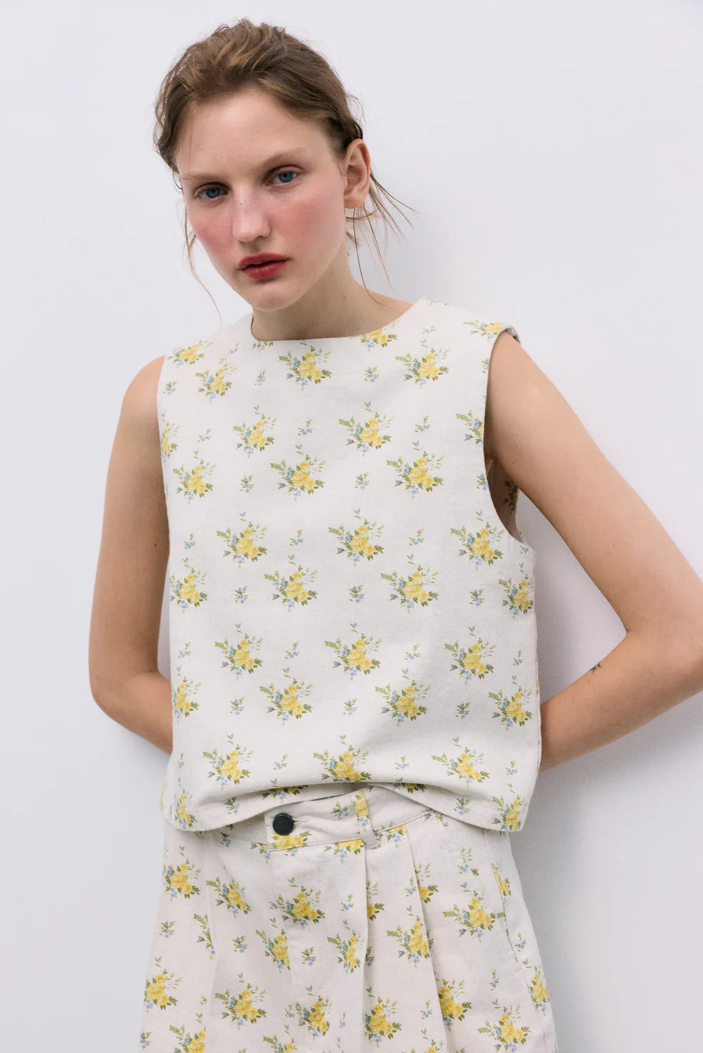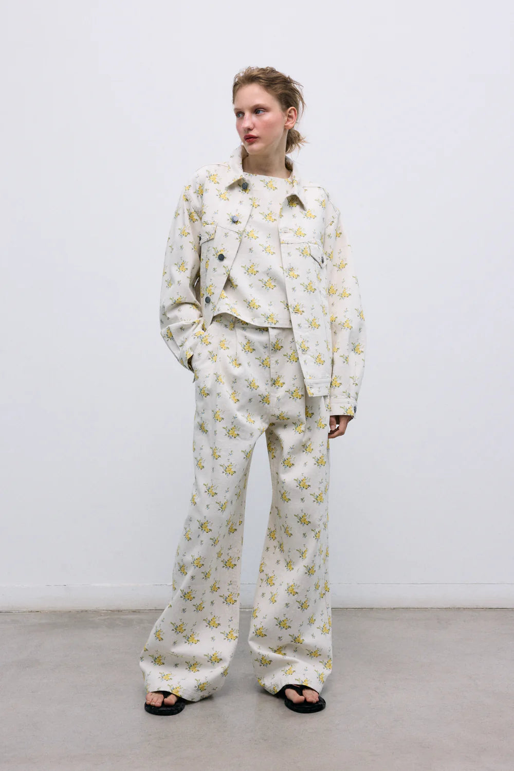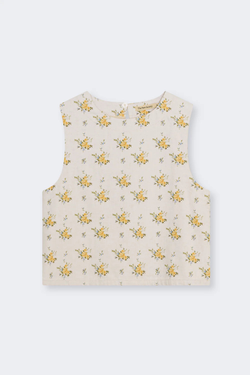 Crafted from organic cotton denim, this top features a beautiful floral print and a delicate back opening with a keyhole and button closure. A versatile piece designed to pair perfectly with the matching pants and jacket for a complete look.