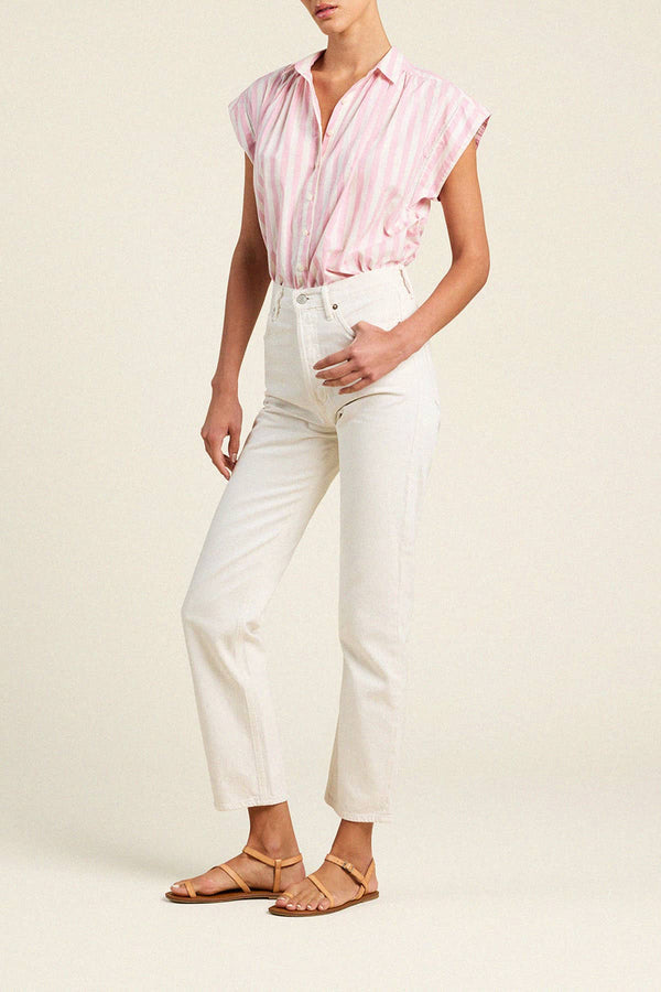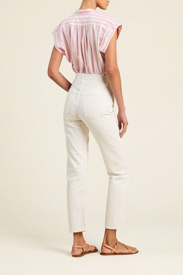 The Della Shirt is a new and refined take on the classic Marianne "B" Blouse. Easy gathers at the front and back body highlight the feminine twist of this shirt. The slightly cropped body has short side slits and is completed with antique white buttons. Shown here in Pink Stripe and made from cotton poplin.