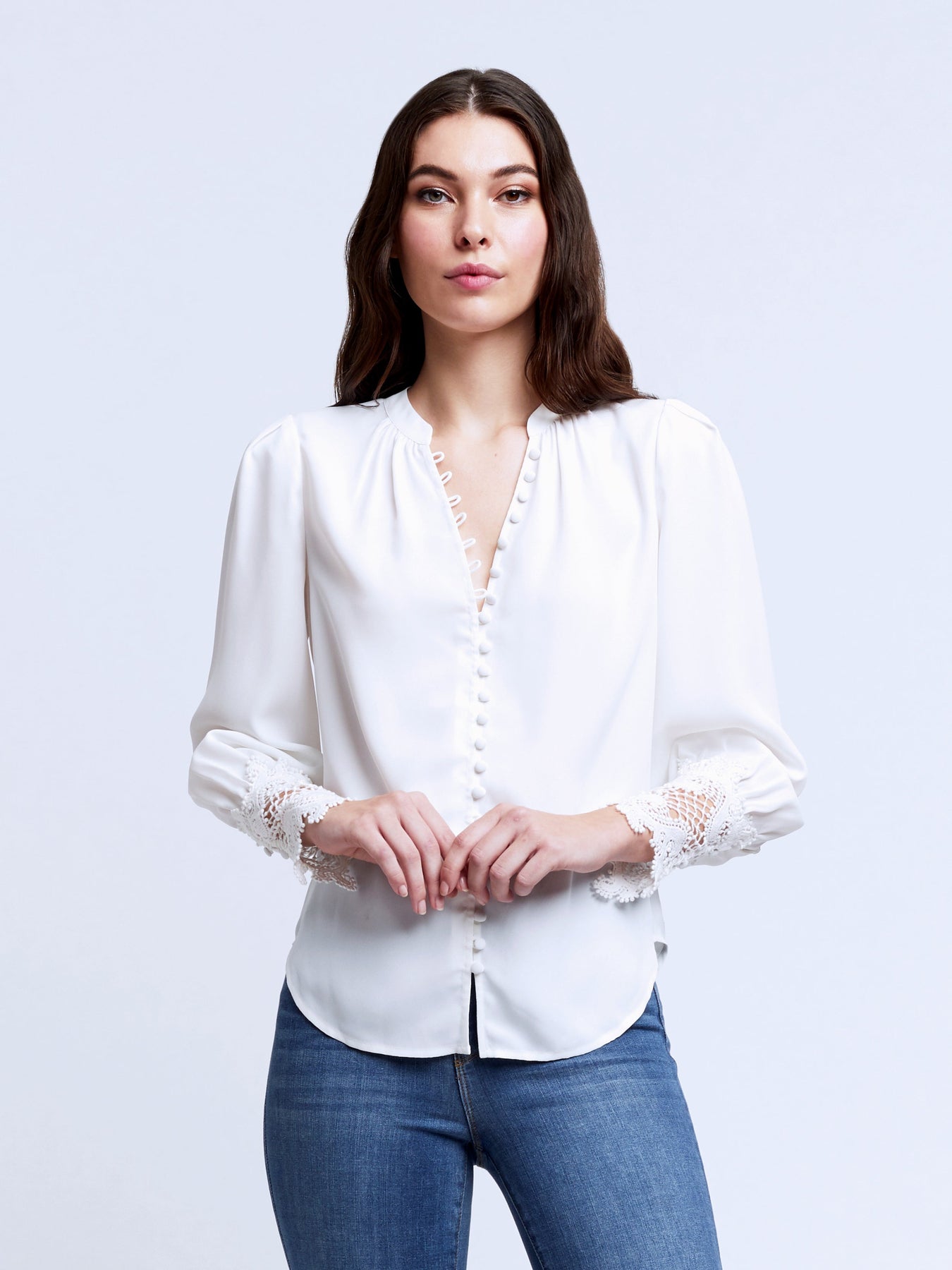 A sublimely chic blouse in ivory. Features vintage-inspired self-button-loop closure and extended cuffs done in exquisite scalloped guipure lace. Relaxed high-low silhouette gathered into band collar. Long sleeves with pleated caps. Front button closure.